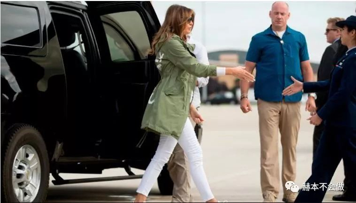 但结束探访移民儿童之后,梅拉尼娅再次穿上这件衣服登上飞机,回到马里兰州,然后继续穿着它走进了白宫。