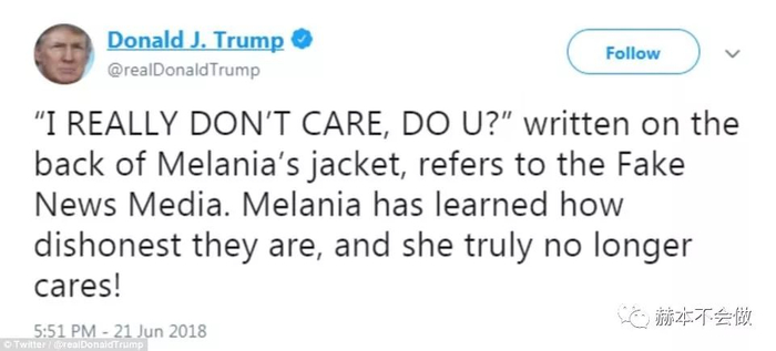 但特朗普发推称,“我真的不在乎”这句话是针对制造假新闻的媒体说的,梅拉尼娅已经悟到这些媒体有多不诚实,她不会再在乎他们。