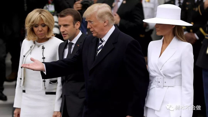比如法国总统马克龙到访美国时,她戴上了标志性的白色帽子。