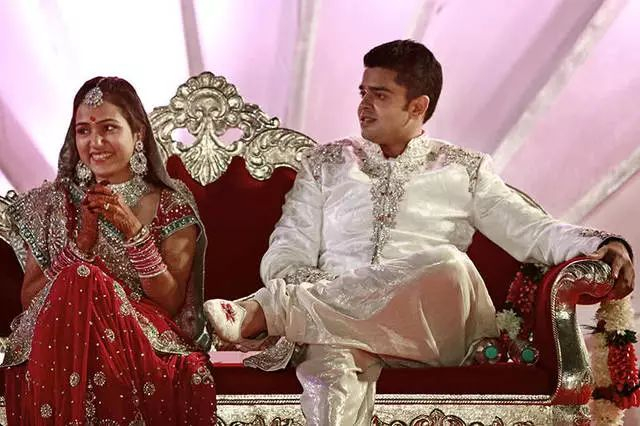 在印度社会中,因为女性地位不高,妇女不能继承地产,所以男子通常认为娶了女人是吃亏的表现,女方家里就会用黄金饰品作为一种变相赔偿,所以金银首饰从过去到现在一直是新娘结婚嫁妆的主要组成部分。印度女子陪嫁以黄金为主,黄金陪嫁品多少决定了以后新娘在家里的地位。图为印度斋普尔一对新婚夫妇在结婚婚礼上。