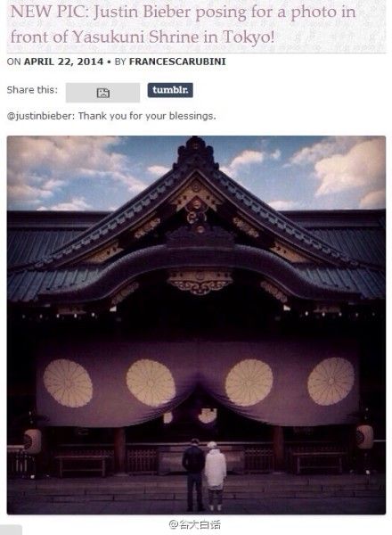 Justin Bieber posing for a photo in front of Yasukuni Shrine in Tokyo! 丁日在靖国神社前拍照留念。(via. 谷大白话)