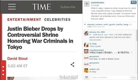 丁日在instagram上对靖国神社拍照事件做出道歉:While in Japan I asked my driver to pull over for which I saw a beautiful shrine. I was mislead to think the Shrines were only a place of prayer. To anyone I have offended I am extremely sorry. I love you China and I love you Japan。(via. 谷大白话)
