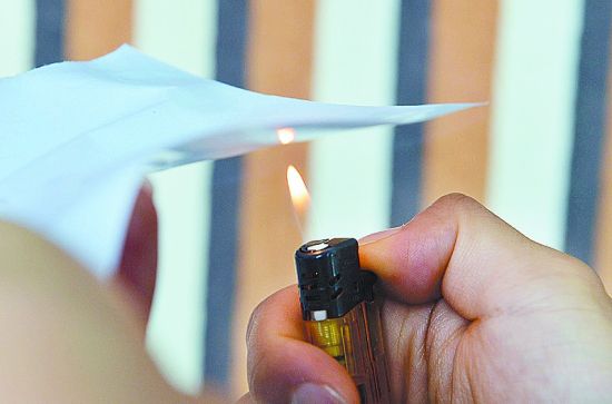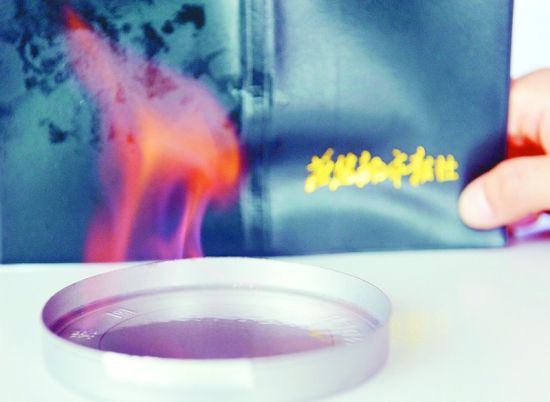 记者向棉布的一部分喷了些花露水,这部分变得湿润,用打火机试着点燃,很快燃烧起来,火苗有20厘米高。