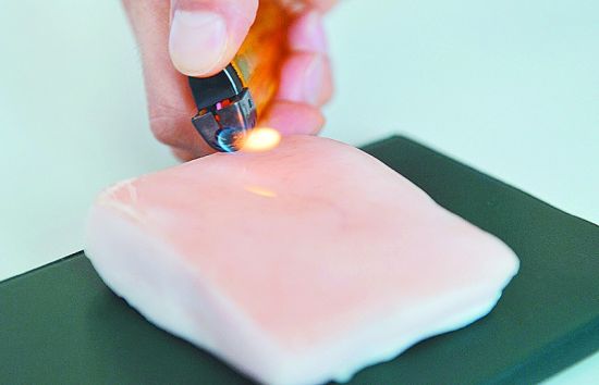 实验物品:花露水、白纸、棉布一块、猪皮、铝制容器、打火机。