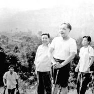 登山途中,邓小平挽起裤管、身着汗衫。