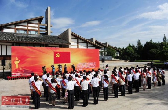 资料图片:四川省广安市邓小平故居陈列馆前,各界党员代表重温入党誓词。新华社记者江宏景摄