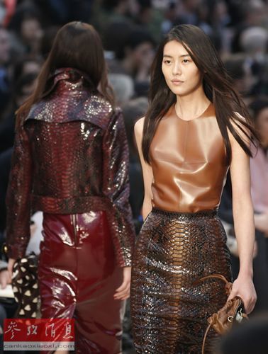 资料图片:2013年,伦敦Burberry Prorsum2013秋冬女装成衣秀上,中国模特刘雯(右)在伦敦时装周上展示Burberry Prorsum2013秋冬女装。