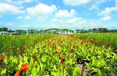 洋湖再生水厂坐落在长沙市洋湖新城科教园区内。8月20日,记者走进其中,仿佛来到一个巨大苗圃。芦苇、菖蒲、水葱、风车草、美人蕉……30余种植物在湿地上葱茏生长,开花结果,茂盛盎然。“眼前这片人工湿地共165亩,它也是污水处理‘设备’。”洋湖再生水厂副总经理左锋告诉记者。