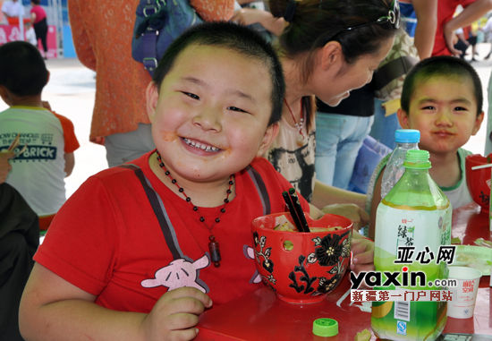 经不住特色美食的诱惑,小“食客”也来一饱口福。亚心网记者 邓莉 摄 ?