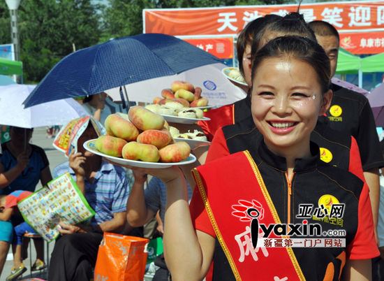 礼仪小姐端着刚采摘的蟠桃请游客品尝。亚心网记者 邓莉 摄