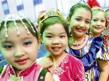 天山网讯(通讯员周建玲摄影报道)8月20日,身着少数民族传统服装的小学生在舞台上表演走秀。8月20日,新疆克拉玛依白碱滩团区委组织了2014暑期“少数民族服饰秀”展示活动,来自辖区四所小学的60多名维吾尔族、蒙古族、汉族、回族小学生齐聚一堂,用表演的形式,展示着多彩的少数民族服饰文化及和谐自然、勤劳淳朴的劳作生活。新疆克拉玛依白碱滩团区委表示,希望通过多民族服饰展示,引导小学生们从小正确认识少数民族服饰,并从中分享童年的欢乐。
