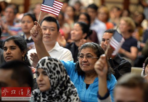 资料图片:2014年7月2日,手持美国国旗的新移民在纽约曼哈顿参加公民入籍仪式。新华社记者王雷摄。