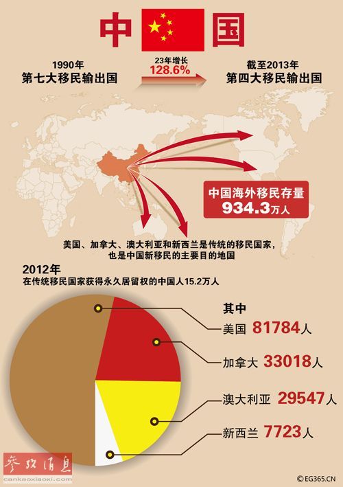 今年1月,中国与全球化研究智库(CCG)和社会科学文献出版社发布的《中国国际移民报告(2014)》蓝皮书显示,截至2013年,中国海外移民存量已达到934.3万人,23年间增长了128.6%,中国已从1990年的第七大移民输出国,上升至第四大输出国。
