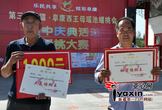 获得“大美蟠桃王”钱兆奎(左)和获得“甜蜜蟠桃王”骆俊学合影