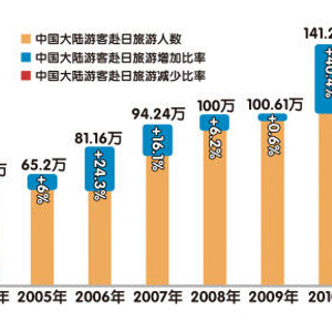 自2005年日本在中国全境开放赴日团体游以来,中国游客便逐年稳定增长。而10年来80%、90%的增长率并不少见,在日本放宽中国“工薪族”自由行签证的2010年,甚至出现了183.4%、142.8%的超高增长率。而这一年,也是钓鱼岛撞船事件发生、日本新版《防卫计划大纲(概要)》出炉,中日外交陷入冰点的“多事之年”。