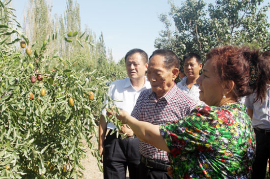 8月28日,在兵团二师30团3连红枣种植基地,袁隆平(左二)走进红枣园,详细了解红枣的产连认真询问滴灌设施的铺设情况以及用水量等问题。