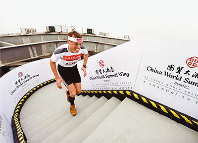9月7日上午,一名选手正冲向楼顶的终点。当日,2014北京国贸大酒店垂直马拉松世界巡回赛在京举行,选手们在高330米、有2041级台阶的大楼里进行角逐。该赛事比赛地点都是世界上的标志性摩天大楼。