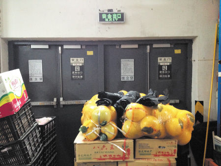 来到超市一层的安全出口,消防监督员发现,安全出口和疏散通道之间是一个敞开式的仓库,仓库内堆满了面条、大米、食物油、水果等物品。有两扇安全门,其中一扇前面堆满货物。