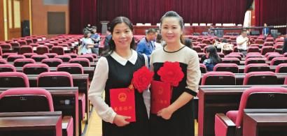 两名获奖女教师在会后合影留念 本报记者 孙立国 摄