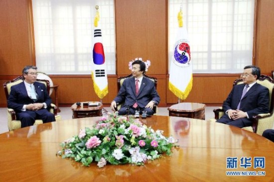9月11日,韩国外长尹炳世(中)在首尔会见中国外交部副部长刘振民(右)和日本外务省审议官杉山晋辅。新华社记者彭茜摄