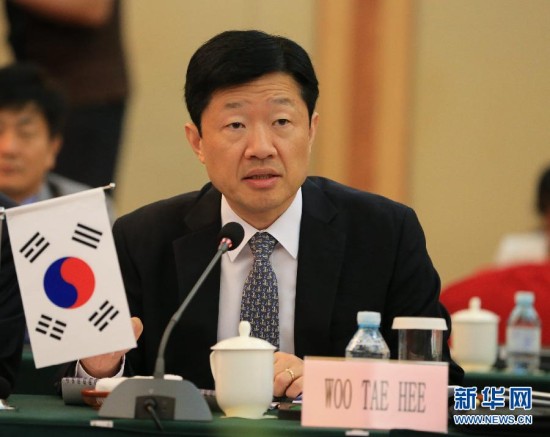9月1日,韩国产业通商资源部部长助理禹泰熙在谈判开幕式上致辞。当日,中日韩自贸区第五轮谈判在北京举行。中国商务部部长助理王受文、日本外务省副部级审议官长岭安政和韩国产业通商资源部部长助理禹泰熙率团与会。本轮谈判将持续5天,三方主要就货物贸易的降税模式、服务贸易和投资的开放等议题展开磋商,并就协定的范围和领域交换意见。新华社记者 邢广利摄
