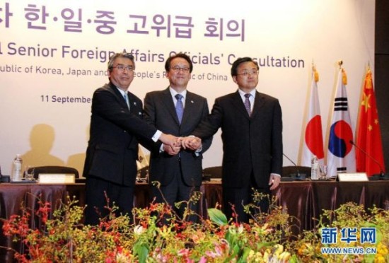 9月11日,中国外交部副部长刘振民(右)、韩国外交部次官补李京秀(中)和日本外务省审议官杉山晋辅出席在首尔新罗酒店举行的“第九次中日韩高层会议”。新华社记者彭茜摄