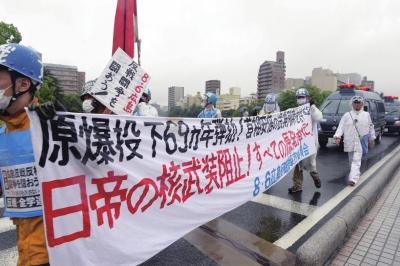 当天,约1000名日本市民在广岛市内举行示威游行,抗议安倍出席广岛和平纪念活动,反对解禁集体自卫权。一位名叫榊的游行参加者说:“安倍通过解禁集体自卫权,想重走战争老路,这样的安倍站在慰灵碑前,参加和平纪念活动,是对原子弹爆炸受害者的不尊重。”