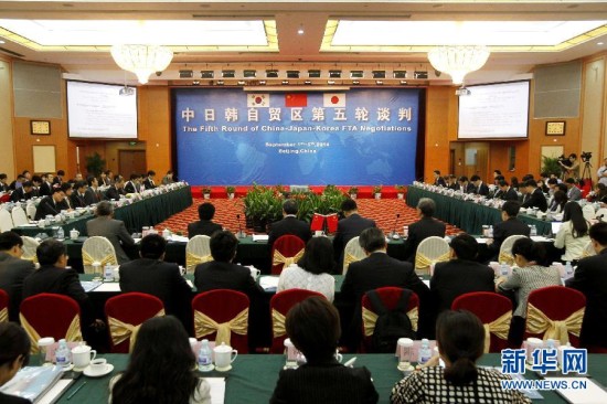 9月1日,中日韩自贸区第五轮谈判在北京举行。中国商务部部长助理王受文、日本外务省副部级审议官长岭安政和韩国产业通商资源部部长助理禹泰熙率团与会。本轮谈判将持续5天,三方主要就货物贸易的降税模式、服务贸易和投资的开放等议题展开磋商,并就协定的范围和领域交换意见。新华社记者 邢广利摄