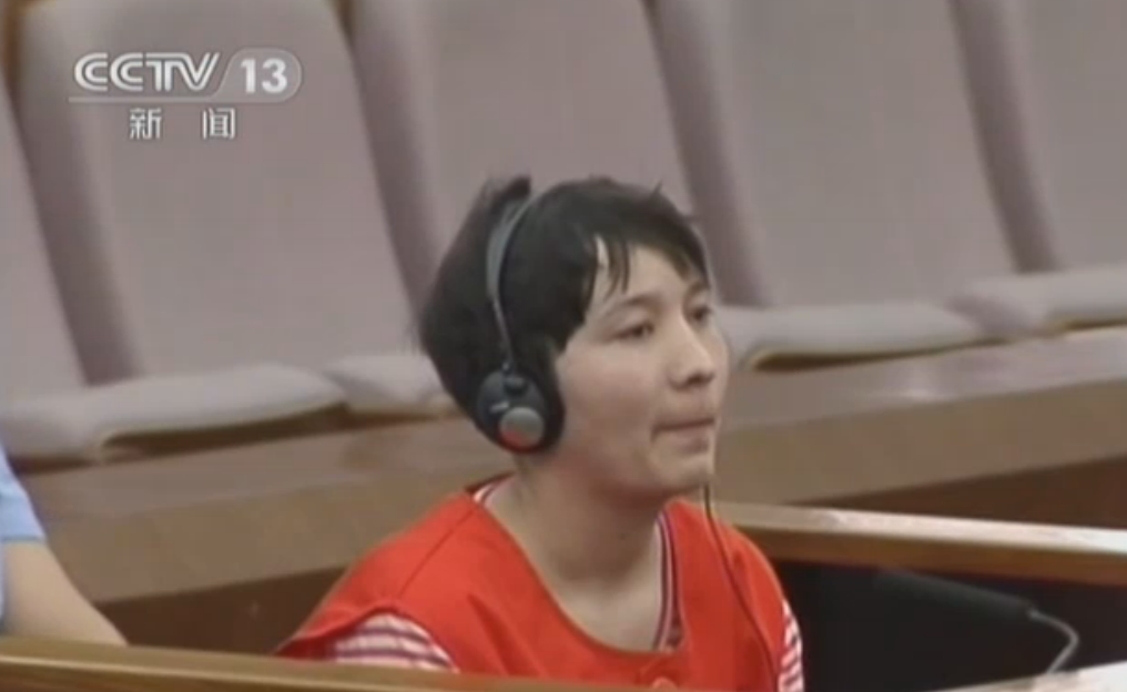 电视台的画面显示,在法庭内,4名被告人身着囚服,其中3人剃了光头,另外一人是女性。