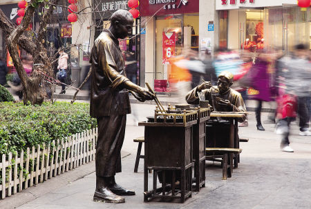 ↑黄兴南路步行商业街“老长沙”铜雕,再现了老长沙人的日常生活。 均为李锋 摄