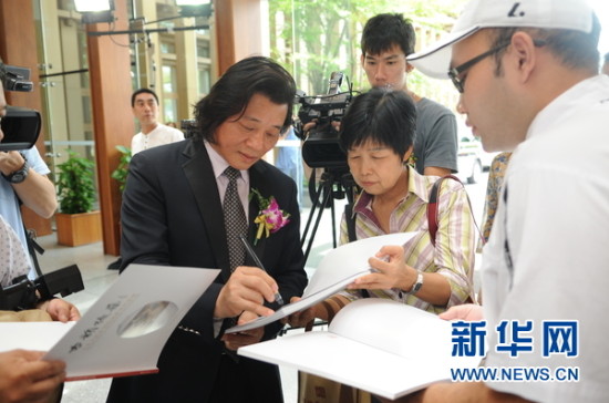7月26日,“古韵焕采”陶瓷微书精品展在曼谷拉开帷幕。图为作者为现场观众题词留念。(新华社记者 毕尚宏 摄)