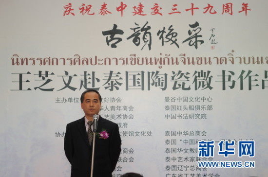 陈疆在开幕仪式致辞时表示,他在本月内已几次参加中泰文化、艺术交流活动,足见中泰两国间文化交流的热络。他相信王芝文此次陶瓷微书作品展,对促进中泰文化艺术交流将起到积极的促进作用。