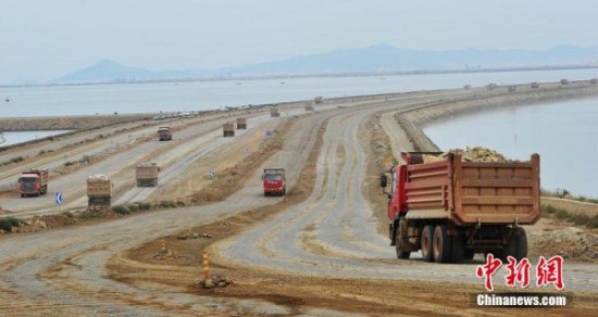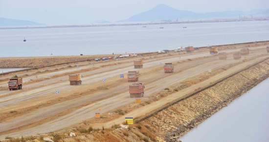 图为众多运输土石方重型卡车穿梭在辽宁省大连新机场建设工地。由于旅客吞吐量增长迅速,大连周水子国际机场目前已经超负荷运行,经过三期改造后,其运输能力也将在2016年左右达到饱和。2012年年初,大连开始兴建大连金州湾国际机场项目。新机场采取离岸填海的方式建设,面积达20.87平方公里,工程总造价初步估算约263亿元,建成后能起降世界最大客机空客A380并成为世界最大的海上机场。