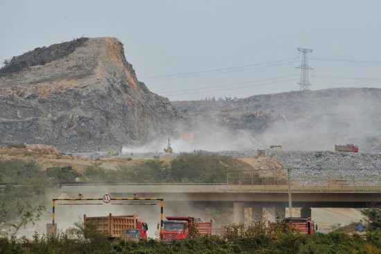 图为众多重型卡车在辽宁省大连新机场附近被开采的山上拉土石方填海。?据媒体2013年8月报道称,这个造价数百亿的新机场不仅没有填海手续,立项都未获批。按规定,我国填海建设的机场项目审批流程是首先须由国家发改委正式审批通过,再经国家环保部环境影响评价审批和国家海洋局海洋环境影响评价审批。新机场的填海工程开始于2012年3月20日,但项目部工作人员和附近村民告诉记者这里在2011年就已开始填海施工。