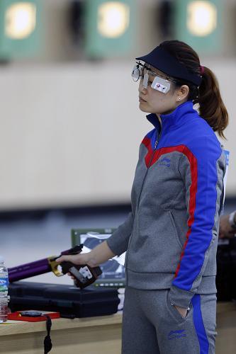 9月20日,中国队选手周庆媛在比赛中。当日,在仁川亚运会女子10米气手枪团体比赛中,由郭文珺、张梦圆、周庆媛组成的中国队以1146环的总成绩获得冠军,斩获本届亚运会和中国代表团首金。新华社记者 张帆 摄