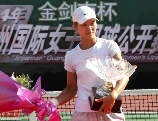 图为2004年10月3日,李娜在2004年WTA广州网球公开赛女子单打决赛颁奖仪式上与冠军奖杯合影。这是中国历史上第一个WTA冠军。