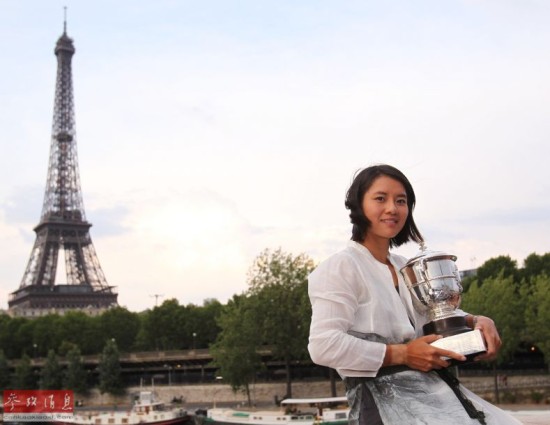 2011年6月4日,李娜手捧冠军奖杯在埃菲尔铁塔附近留影。中国选手李娜在2011年法国网球公开赛女子单打决赛中,以2比0战胜意大利选手斯齐亚沃尼,获得冠军。这是中国、也是亚洲选手第一次夺得大满贯女单冠军。