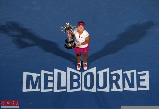 2014年1月26日,中国选手李娜在墨尔本海边展示奖杯。在2014年澳大利亚网球公开赛女子单打决赛中,以2比0战胜斯洛伐克选手齐布尔科娃,夺得冠军。