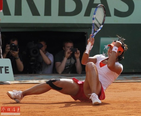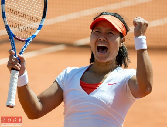 图为2011年6月2日,中国选手李娜在女单半决赛获胜后庆祝。6月4日,中国选手李娜在2011年法国网球公开赛女单决赛中,直落两盘击败意大利选手斯齐亚沃尼,夺得冠军。