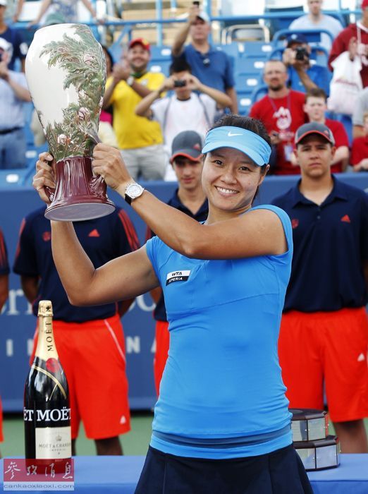 图为2012年8月19日,李娜在2012年WTA辛辛那提网球赛女子单打决赛颁奖仪式上与冠军奖杯合影。这是她首次获得WTA超五赛冠军。