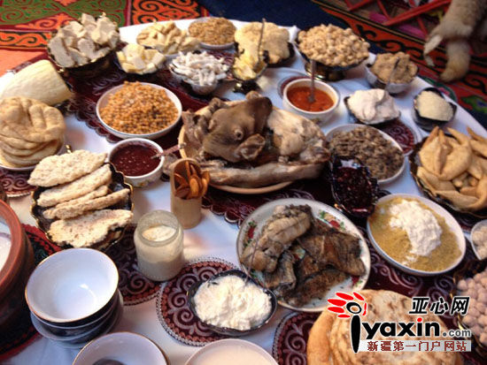 在农牧产品展销会中展出的哈萨克族满汉全席让来参加活动的群众大开眼界,赞不绝口。