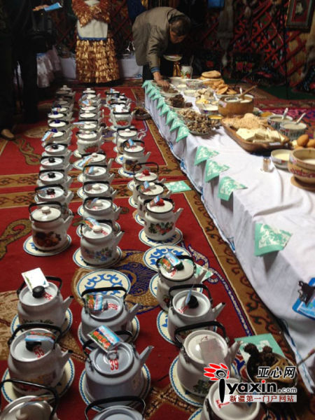 毡房中摆放了56个独具哈萨克族风情的奶茶壶,每个奶茶壶中都盛放着不同口味的奶茶,薄荷奶茶、玫瑰花奶茶、酥油奶茶、炒面奶茶、初乳奶茶、银杏奶茶…… 56种不同的奶茶让人目不暇接,前来品尝的群众面对这么多种的奶茶口味选择也大呼过瘾。