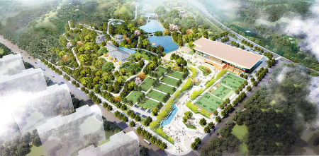 谷山体育公园一期占地约237亩,主要建设内容包括:羽毛球场42个、网球场10个、乒乓球场7个、篮球场6个、足球场2个、专业体育运动馆、室内恒温游泳馆、山地自行车赛道、登山道等,为市民提供一个环境优美、功能齐全的健身活动场所。图为公园一期整体效果图。