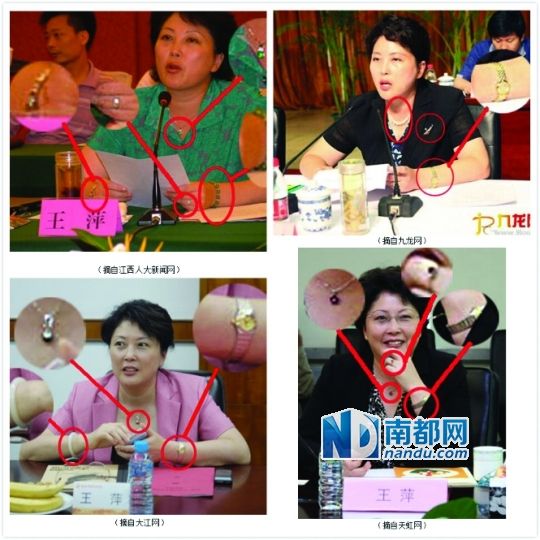昨天在微博上流传的王萍照片一共七组,其中五组分别汇总了项链、胸花、手表、手镯以及戒指等王萍出席不同场合穿戴的饰品,仅以胸花为例,粗略数下来就有20余款。从来源看,这些照片大多来自大江网、江西人大新闻网等地方新闻网站和政府官网,较早的一些甚至可以追溯到2008年前后。