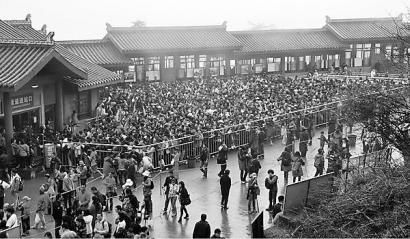 资料图:旅游高峰,峨眉山的游客排队等缆车。今年,峨眉山的门票价格上调了35元