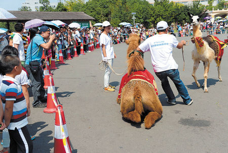 昨日11时左右,记者购票排队进入长沙生态动物园,园内人头攒动。长沙生态动物园从9月30日至10月31日,推出了“第三届动物狂欢节”,每天12时30分进行一场表演。约12时15分,动物明星们被陆续拉到表演区。它们一出现,立即被游客围观。一只骆驼略显疲惫,跪在地上休息,工作人员顺势坐在它身上抽着烟候场。几分钟后,两只仅3个月大的东北虎被两名工作人员牵着进入候场区,也许是受到惊吓或天气炎热,一只小老虎眼神惊恐,不肯迈步,驯养员索性用铁链拽着它的脖子拖行了数米,后来实在拖不动了,只好花力气抱着它出场亮相。“爸爸,小老虎好可怜!”一名6岁左右的孩子看见这一幕后对家长感叹。