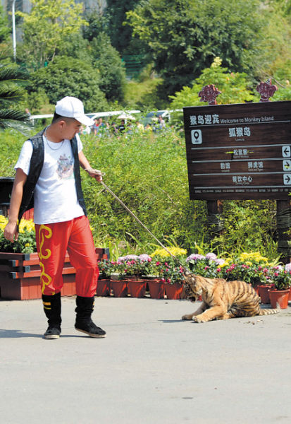 ↓昨日中午,在长沙生态动物园,这只受到惊吓的小老虎被驯养员硬生生拉着拖行。均为首席记者石祯专 摄本报讯(首席记者 石祯专 实习生 余劭劼)昨天是国庆长假中的普通一天,对于所有动物来说,却是个特别的日子——“世界动物日”。当人们沉浸在欣赏各种动物表演的快意中时,长沙的动物明星们却“有苦难言”:骆驼累得趴下、山羊卖力拉车、小虎被强行拽着“露脸”、大象频繁被人骑着拍照、海豚演出倍增……由于黄金周游客量猛增,动物们不得不加班加点,卖力进行着各种表演,以赚取人气和财气。