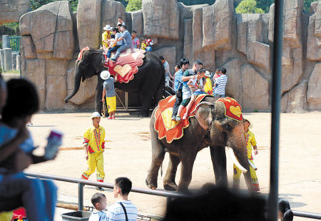13时30分是大象表演时间,大象馆近3000个座位坐得满满当当。平时大象每天会演出4至5场。现场一名安保人员告诉记者,因黄金周游客量猛增,至少会增加一场。除了正常演出,还有一项重要的“工作”:和人合影。13时许,主持人在音乐的配合下,邀请观众骑着大象拍照留念。忙碌的售票人员告诉记者:“一个大人带一个孩子骑象合影150元,一个大人带两个小孩合影200元一次。”记者现场统计了一下,演出前,至少有40名家长带着孩子骑象合影。