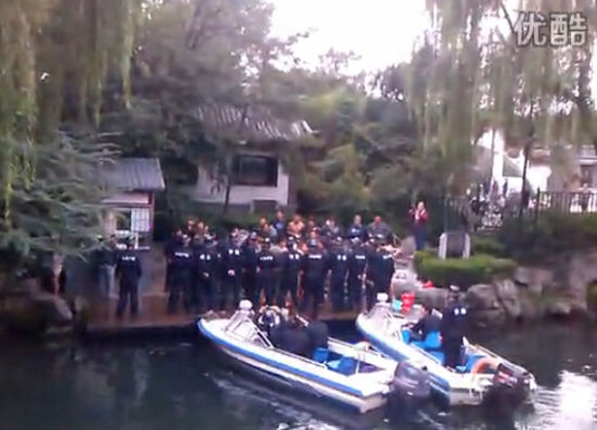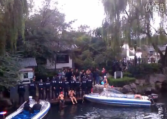 网络视频截图,十几名工作人员阻止市民下水遭围观。