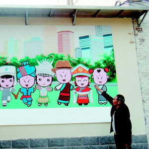 昨天上午9时许,小北关社区办公室门前,众人争相观赏墙上的巨幅宣传画。这幅宣传画长约4.2米、高约3.5米,名为《社区民族一家亲》。画的中间为8个身穿民族服饰的人物,每个小人高约1.2米,身后是郁郁葱葱的树林,远处则是高楼大厦,很有立体感。在人物像下方,用白底蓝字写着这幅画的名称。从远处看,这幅画布局合理,色彩艳丽,让人看上去感觉非常舒服。